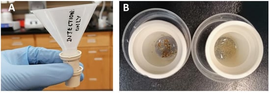 Assemble—from top to bottom—a funnel, a coarse-filter basket, and a fine-filter basket (Figure 3A). Next, pour the upper half of the egg collection water into the sink (the eggs are at the bottom of the jar). Then swirl and pour the remaining water with the eggs into the funnel/filter system. The coarse-filter traps sponge fibers and flies, while the fine filter collects the eggs (Figure 3B). Rinse the 2-L jar once with 100–200 mL of distilled water, then pour it through the filter system to collect the remaining eggs. With a squeeze bottle of distilled water, wash the eggs off the upper filter and allow them to slip through the coarse mesh into the fine filter below. After obtaining a sufficient number of eggs in the lower filter, remove the baskets from the funnel and wash the eggs thoroughly with distilled water from a squeeze bottle. Then, put the basket with the washed eggs into a bottom half of a small Petri dish, which is halfway filled with distilled water. Line up the eggs under a dissection scope.