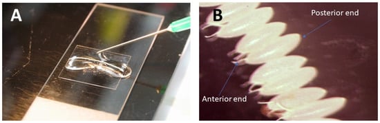 (A) Adding the halocarbon oil mixture to a line of eggs. (B) The anterior ends of the eggs contain the filaments (left), while the posterior ends point to the right.
