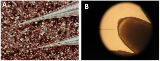- Miller, D.F.; Holtzman, S.L.; Kaufman, T.C. Customized microinjection glass capillary needles for P-element transformations in Drosophila melanogaster. Biotechniques 2002, 33, 366–375. [Google Scholar] [CrossRef] [PubMed]