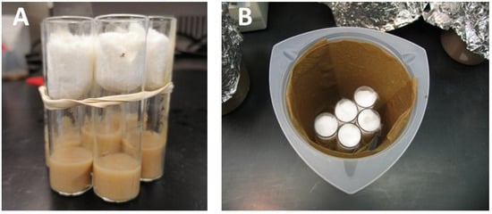 Collection of pupae and after-care. (A) Pupae are collected from the cotton plugs with fine forceps. (B) Pupae collected on moist anti-fungus paper in a hatching vial and stored angled upwards in a moist chamber.