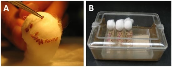 (A) Vials are bundled together with a rubber band. (B) A wet chamber for the vials containing injected eggs.