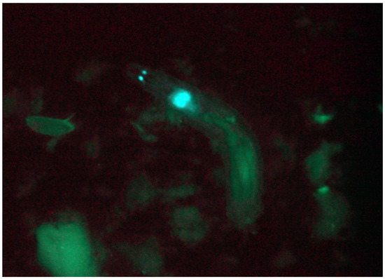 The perfect timepoint for screening for transgenic larvae is 3 days after the parents have been removed from the vials, as all larvae would have hatched, but the pupae would not have formed yet. EGFP can only be detected in larvae but not in eggs, pupae, or the adult flies. Look for EGFP in the larval eye disks, Bolwig organs, brain, and/or in the anal plates (Figure 8) [20]. EGFP expression is usually strong and clearly visible in all larval instars. Finding multiple positive larvae per vial is not uncommon. Note that many transgenic lines are obtained in later screening sessions, so it is worth the time and patience bumping the crosses for 2 or 3 weeks before declaring them negative.