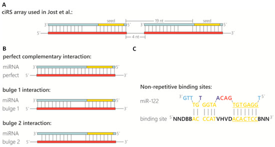 Figure 1. Design of miRNA binding sites contained in circular RNA sponges. (A) Representation of the ciRS array used by Jost et al. [19] for sequestration of miR-122 (light blue). The array is characterized by miRNA binding sites (red) containing a bulge between nucleotides (nt) 10–12 and a spacing of 4 nt between binding sites resulting in a distance of 19 nt between the adjacent miRNA seed sequences (yellow). (B) Schematic representation of different potential miRNA binding sites with distinct complementarity to the target miRNA. (C) Non-repetitive miR-122 binding site for more efficient circularization. - Binding site types and specificity: The configuration of the miRNA binding site itself is also an important feature (Figure 1B). In sequestration of miR-122 from HCV, a bulged binding site lacking complementarity at nucleotides 10–12 was most effective [19]. Although a perfectly complementary site might appear thermodynamically superior, the occurrence of miRNAs in a complex with Ago2 in the cytoplasm renders bulged binding sites most effective [19,27]. In addition, a perfectly complementary binding site is assumed to be cleaved by the miRNA-RISC complex [27,28], although we did not observe cleavage of the perfectly complementary binding sites in any circular RNA sponges in cells [19]. Another feature to consider is the complementarity at the miRNA 5’ and 3’ ends (Figure 1B, compare “bulged 1” and “bulged 2”). Base-paired ends of binding sites were reported to cause tailing or trimming of the targeted miRNA, which can lead to miRNA degradation [29,30]. In the context of the miRNA sponges tested, we never observed tailing, trimming or degradation of miR-122 [19]. To test the specificity of the chosen miRNA binding sites and to prevent off-target effects, a miRNA binding site can also be designed and/or tested using a publicly available bioinformatics tool tailored to generate and test artificial miRNA binding sites. The “miRNAsong” tool (MicroRNA SpONge Generator and tester) is a valuable resource in this regard [31].