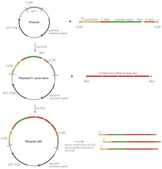 Figure 2. Template generation for ciRS production. Overview of cloning procedure for ciRS construction starting with insertion of the T7 promotor (yellow), a double-stranded stem-loop region (5′ stem and 3′ stem; orange), and a constant region (green) via EcoRI into a multipurpose vector backbone. Afterwards XbaI is used to insert the designed ciRS array consisting of multiple miRNA binding sites for the miRNA of interest. The final ciRS-vector is amplified, and templates are prepared.