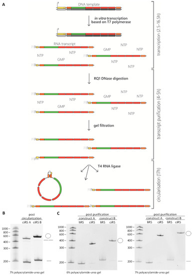 - Template generation as starting point for ciRS production in vitro. Conventionally, templates contain the following elements: a T7 promotor sequence for in vitro transcription, several binding sites complementary to the miRNA of interest, and optionally a double-stranded stem-loop sequence at the respective 5′- and 3′-termini to enhance circularization efficiency (Figure 2). The latter is characterized by a double-stranded stem of 11 nt with a non-basepaired overhang of 5 nt on both ends forming the open loop of 10 nt in total (contained in construct B, Figure 3). Despite using a double-stranded stem-loop, other circularization strategies (e.g., using splint oligonucleotides that anneal at both ends) can be used. Note that depending on, e.g., the length and sequence of individual templates, circularisation can also be observed for transcripts lacking the double-stranded stem-loop and without using a splint oligonucleotide (see Figure 3, construct A). Despite the mentioned features, we also typically include a region that is universal for all miRNA-sponge constructs and negative controls of a certain set (“constant region”), which serves as a binding site for PCR primers, antisense probes in northern blotting or in situ hybridization procedures. This region spans 63 nt in the templates used here. Moreover, it enables a reliable comparative quantification of different constructs. Adding flanking restriction sites enables cloning into a plasmid of choice. The described sequence elements can be obtained from any company offering gene synthesis services and are available within a multipurpose vector backbone upon request. Plasmids can be purified at a large scale, and the in vitro transcription template can be excised and gel-purified via agarose gel electrophoresis (Figure 2). Afterwards, templates are subjected to in vitro transcription reaction.