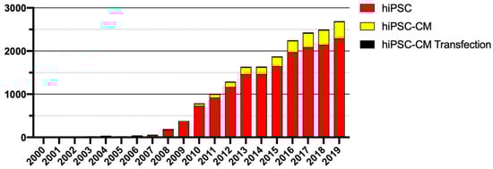 Publications by year in regard to human pluripotent stem cells (hiPSC)s, human pluripotent stem cell-derived cardiomyocytes (hiPSC-CM)s and their transfection [21].