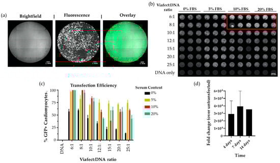 Optimisation of hiPSC-CM transfection with Viafect™. To determine the experimental conditions ensuring highest TE, hiPSC-CMs were replated in 96 well plate format and transfected with reporter plasmid pmaxGFP under several combinations of serum content and Viafect:DNA ratios. (a) High content fluorescence imaging enabled determination of transfection efficiency (TE) in hiPSC-CMs; (b) Optimisation of serum content and Viafect to DNA ratio in 96 well plate format revealed that (c) transfection with 6:1 Viafect:DNA ratio in medium containing 10% foetal bovine serum (FBS) achieves >95% TE; (d) Sustained expression of a lncRNA in hiPSC-cardiomyocytes. The results were normalised to an untransfected control. n = 3 biological replicates (4 days and 7 days), n = 1 (14 days). Scale bars in (a) = 1 mm, (b) = 10 mm.
