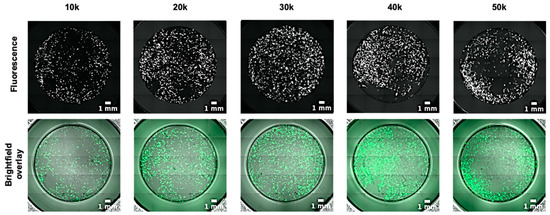 2D hPSC-CM phenotyping assays rely mostly on cell clusters or monolayers [32,33]. Thus, different hPSC-CM densities were tested to ensure compatibility with those assays. We observed that optimum density levels ensuring high TE (above 90%) were in the range of 30–40 K hiPSC-CMs per well (96 well format, Figure 3), which translates to an approximately 80% confluence, whilst also avoiding drawbacks of high-density cultures (50 K/well) where cells tend to peel off and detach. We settled on an average of 35,000 cells per well of a 96 well plate, as it provides an adequate pool for further experiments. However, while the transfection of hiPSC-CMs did not change the high purity (Supplementary Figure S1d), the total number of cardiomyocytes decreased by ~34%, indicating ~66% cell viability (Supplementary Figure S2a–c).