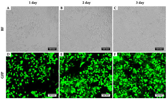 Using this method for the production of lentiviruses, using the plasmids pMD2 (Addgene plasmid #12259), PAX2 (Addgene plasmid #12260) and pLenti-CMV-GFP Hygro (656-4) [8], we obtained viral titers up to 1.5 × 108 TU/mL. Measurements of the calculation of the efficiency of transduction with lentivirus were carried out on a CytoFLEX flow cytometer (Beckman Coulter, Brea, CA, USA). As an example, we present a photo of HEK293T for three days during the virus production (Figure 2). Figure 2 compares two techniques: the bright field presents a number of cells infected with the virus and their morphological alterations, while GFP depicts the viral assembly. With the three days of growth, an increase in the GFP intensity is noticeable and so too the assembled viral particles.