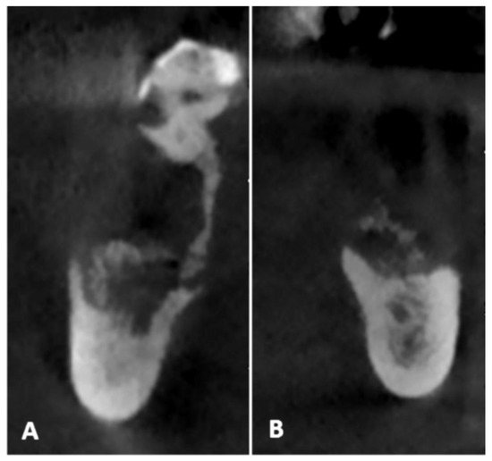 The presence of altered bone morphology on the preoperative CBCT (A,B), with the involvement of the right-sided mandibular canal with loss of root continuity (A).