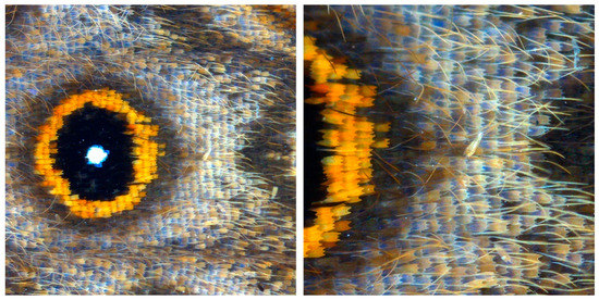 - Prudic, K.L.; Stoehr, A.M.; Wasik, B.R.; Monteiro, A. Eyespots deflect predator attack increasing fitness and promoting the evolution of phenotypic plasticity. Proc. Biol. Sci. 2015, 282. [Google Scholar] [CrossRef] [PubMed]