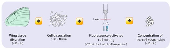 The main experimental stages for the preparation of a single-cell scale suspension include: (1) dissection of the wing tissues, (2) cell dissociation from the wing tissues, (3) fluorescence-activated cell sorting (FACS), and (4) concentration of the single-cell suspension (Figure 2). This is followed by single cell sorting into individual emulsion droplets, library preparation, and single-cell sequencing which was done through an independent service (Genome Institute of Singapore). We used 10x Genomics for the single cell partitioning and library preparation step. It is important to note that the choice of technique for downstream cell partitioning and library preparation depends on the depth and breadth of cell profiling required [21,22,24]. All the stages in this protocol have to be done on the same day to ensure the use of live cells.