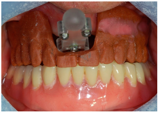 The patient refused any bone grafting and required the quickest possible solution. Several treatment options were evaluated: narrow, tilted, pterygoid, intra-sinus, and zygomatic implants. The patient opted for a zygomatic implant rehabilitation. Consequently, upon completion of the informed consent form, the patient was enrolled in a clinical trial approved by the Ethical Committee of S. Orsola-Malpighi University Hospital, Bologna, Italy. A provisional denture was made to investigate the inter-arch relationship and occlusion for planning an immediate loading. A resin-based duplicate of the prosthesis was prepared as a radiographic template. A provisional narrow implant with the coronal spires machined (MSC-IBNT, Southern Implants, Irene, South Africa) was placed under local anesthesia with a flapless technique into the premaxilla. A marker plate containing the fiducial markers for the navigation system calibration was directly screwed onto the provisional implant. After removing any interference, the radiographic template was placed in situ (Figure 2) and the Cone-Beam Computed Tomography (CBCT) was taken.