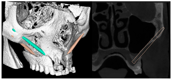 Then, the marker plate was unscrewed and repositioned on the day of the surgery. The ImplaNav dynamic navigation system (BresMedical, Sydney, Australia) was used for zygomatic implant planning and placement. The planning of the ZIs position was made using the navigation system software. The three-dimensional implant trajectory was planned according to the prosthesis position aiming to reach a good prosthetic emergence (Figure 3).