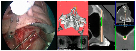 In this way, the infrared camera of the navigation system could record both the position of the patient and the surgical handpiece and the system could display onto the screen the drill position on the patient’s CBCT images. The system registration/calibration proceeded with the use of the three fiducial markers. They are located on the marker plate and must be touched in sequence with the first drill to allow the navigation system to identify the patient position. The system can detect the position of the handpiece by setting up the calibration tool as a drill and exposing it for a few seconds at the navigation system camera. A full-thickness flap enables access and visualization of the malar bone. The site preparation for the zygomatic implant, from the residual alveolar ridge to the zygomatic bone, was done using the navigation system that tracked each drill. The surgeon was able to follow the intended trajectory of the implant on the real-time navigation system screen (Figure 5).