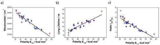 Dependence with the ET30 (kcal mol–1) value of (a) wavenumber of emission maximum peak, (b) long lifetime and (c) intensity ratio between emission at 450 nm and emission at 500 nm (I450/I500) of acridones 1 (green), 2 (red) and 3 (blue).