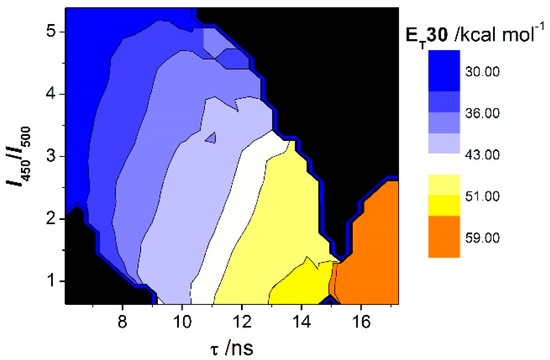 In the development of this method, we focused on the dependence of ET30 on two parameters of the N-substitued-2-methoxyacridones: the intensity ratio (I450/I500) and fluorescence lifetime (τ); see Equation (1). A 3D correlation plot can be constructed (Figure 3) showing the multiparametric dependence of the fluorophore properties on the polarity ET30 scale.