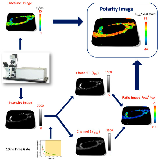 Once we have calibrated our probe, we can introduce it in the media we are interested in interrogating—for example, to explore intracellular polarity. To apply the method described herein, it is necessary to use a microscopy technique able to acquire simultaneously all the sensitive photophysical parameters chosen for the calibration. In this particular case, a multiparametric fluorescence imaging technique is of special relevance, such FLIM, able to obtain a multilayer image containing intensity and lifetime information with spectral and spatial resolution.