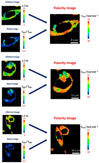 Regarding the necessary equipment to carry out this method, a dual-channel fluorescence lifetime imaging microscope (FLIM) is the main instrument to be employed. The method to build up accurate intracellular polarity maps is based on a multilinear calibration of, at least, two independent parameters characterizing the probe emission. Hence, the confocal fluorescence microscope must be equipped with time-resolved, photon counting electronics for FLIM imaging and, at least, two different detection channels with different filters to collect two independent color images, aiming to reconstruct ratiometric images.