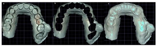 The virtual model obtained after the scanning of the waxed-up plaster cast (a). The virtual model after the digital cancellation of the teeth (b). The virtual model after the digital filling of the empty spaces (c).