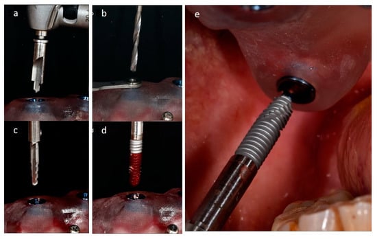 Pterygoid implant beds’ preparation with the printed surgical guide fixed in place: the cortical perforator (a), the following twist drill (b), the shaping drill burs (c), and the implant seating with the implant carrier (d,e).