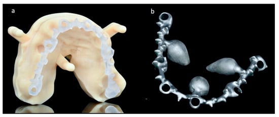 The framework printed in resin after digital planning (a) and the metallic melted one (b).