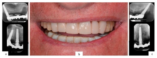 The temporary prosthesis delivered 24 h after surgery (b), with the X-rays check of the prosthetic framework fitting (a,c).