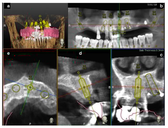 After the wax-up STL’s file was loaded into the surgical software, implants were planned. The software allowed by its windows, a deep check of each implant’s placement, both in the 3D (a) view and in the 2D views (b–e).