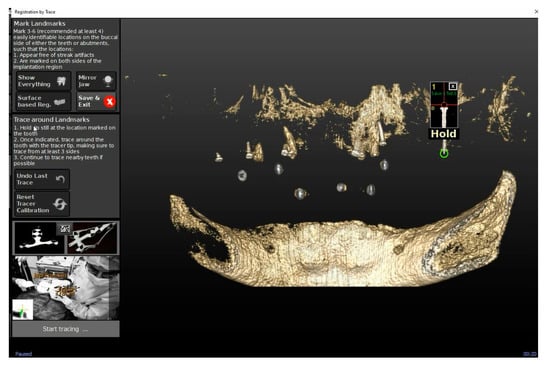 A 65 years old partially edentulous man with severe mobility of the remaining teeth asked for a full implant-supported prosthetic rehabilitation. A preliminary IOS (Medit i500, Seoul, South Korea) impression was taken to set up a digital wax-up and a CBCT was carried out to evaluate the available bone volume. Before taking the CBCT, four mini-screws were inserted into the alveolar bone functioning as fiducial landmarks for the trace procedure. The so-called “TaP” (Trace and Place) approach was used to perform a dynamic navigation system supported surgery []. This consisted of three different steps: Plan, Trace, and Place.