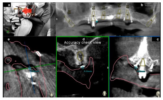 Before starting implant bed’s preparation the operator (a) performed an accuracy check of the tracing procedure to verify the congruency between the touched point and its radiological representation, for each available plane (b–e).