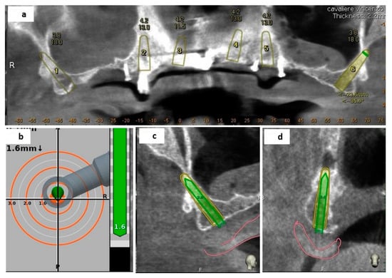 The digitalization in implant-supported prosthetic rehabilitation is becoming more and more diffuse not only for the planning but even for the operative phase, for transferring the project into the clinical reality [,,,]. In a fully computerized protocol the Digital Imaging and Communication in Medicine (DICOM) data from a cone beam computerized tomography (CBCT), related to the features of the hard tissue, and the 3D standard tessellation (STL) data, from an intraoral scanner (IOS) detection, related to the teeth and soft tissues surfaces, are paired by a dedicated software; this enables the clinician to choose the implant characteristics and positions according to the anatomical and prosthetic demands [,]. After that, to reproduce the virtual plan, the static computer-aided implantology (SCAI) systems or the dynamic computer-aided implantology (DCAI) ones can precisely guide the operator’s hand.