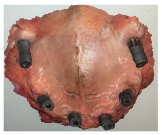 Six implants (A-Z implant, San Lazzaro di Savena, BO, Italy), two pterygoids, and four frontal, according to the so-called “Da Vinci Bridge” protocol, were inserted with a flapless approach. After implant insertion (all implants resulted in torque higher than 35 Ncm, indicating good primary stability), multi-unit abutments (M.U.A.) were selected and screwed onto implants.