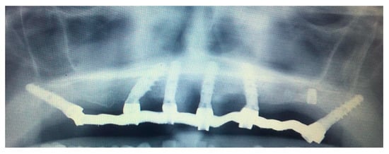 The temporary rehabilitation was delivered and connected within 24 h left from the surgery and a post-operative CBCT was taken to check the final placement of the pterygoid implants. At the same time, periapical X-rays were taken to check the correct fitting of the restoration on each abutment (Figure 7).