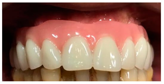 A digitally printed resin template recorded the occlusal relationship between the arches. After 24 h the temporary prosthesis was delivered, an occlusal check was carried out and a final digital panoramic X-ray (Figure 13) was performed to check prosthesis fitting (Figure 14).