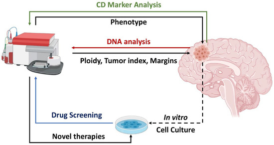 Utility of Flow Cytometry in central nervous system malignancy (CNSM) analysis. CNSM cells can be directly analyzed intraoperatively or post-surgical for DNA content (red arrow), offering information on ploidy, tumor index, and tumor margins. CNSM analysis for Cluster of Differentiation (CD) markers (green arrow) can provide information on tumor phenotype and possibly on the clinical outcome. Analysis of in vitro CNSM cultures (blue arrow) may offer insights on drug efficacy. Created with BioRender.com.