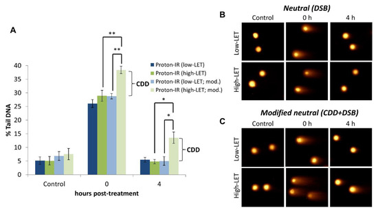 - Olive, P.L.; Banáth, J.P.; Durand, R.E. Heterogeneity in Radiation-Induced DNA Damage and Repair in Tumor and Normal Cells Measured Using the "Comet" Assay. Radiat. Res. 1990, 122, 86. [Google Scholar] [CrossRef]