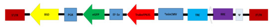 Schematic presentation of lentivirus transfer plasmid pTet-turboFP635-EF-1a-eGFP-PKG-BSD.