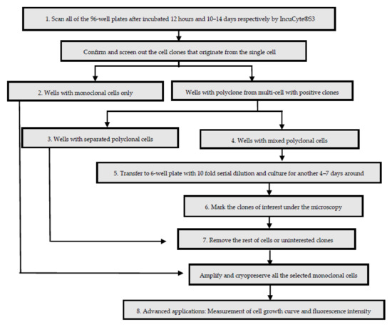 The steps of monoclonal cells selection are showed in the Workflow (Figure 3). The Different Steps in Workflow Marked with Numbers (1–8) in the Rectangles Are Matched with the Followed Procedures (1–8).
