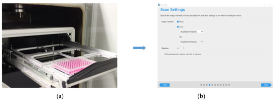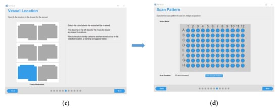 Figure 4. Steps of IncuCyte®S3 whole well image for the 96 wells plate scanning. (a) Put the 96-well plate into the IncuCyte®S3. (b) Select the image channels. (c) Chose the vessel location. (d) Select the wells for scanning.