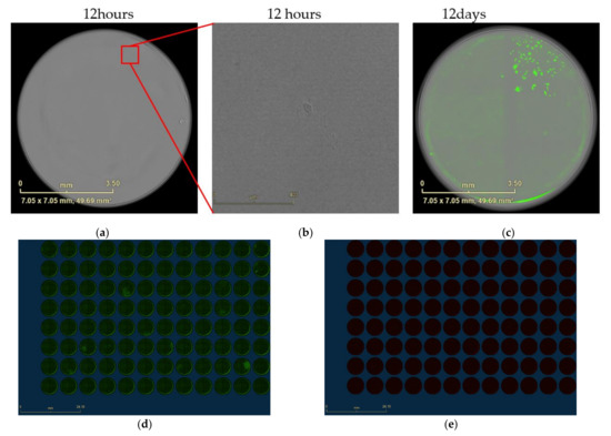 Figure 5. IncuCyte®S3 whole well image of the 96-well plate scanning (a–e). (a) Image from 96-well plate scanned after 12 h incubation by bright phase, scale bars represent 3.5 mm. (b) Image enlargement (IE) from (a), scale bar = 0.4 mm (c) The same well scanned after 12 days incubation with overlap of fluorescence image and bright field image. Scale bars represent 3.5 mm. (d) Expression of eGFP in diluted cells detected by direct green fluorescence after 12 days incubation. (e) Expression of TurboFP635 in diluted cells detected by direct red fluorescence after 12 days incubation. Scale bars represent 24.1 mm.