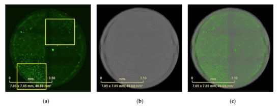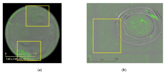 Figure 7. Wells with separated monoclonal cells imaged after 12 days incubation (a–c). (a) Well scanned by eGFP fluorescence. (b) Bright field image. (c) Overlap of fluorescence image with bright field image. The yellow squares show two separated monoclonal cells, all scale bars represent 3.5 mm.