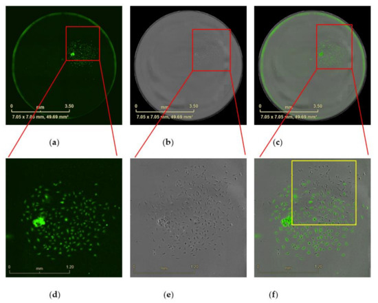 Figure 8. Wells with polyclonal cells in close proximity or mixed with each other. Images from 96-well plate scanned after incubated for 12 days. (a) Well scanned by eGFP fluorescence. (b) Bright field image. (c) Overlap of fluorescence image with bright field image. (a–c) Scale bars represent 3.5 mm. (d) Image enlargement (IE) from (a). (e) IE from (b). (f) IE from (c). (d–f) Scale bar = 1.2 mm. The yellow square shows polyclonal cells mix with each other.