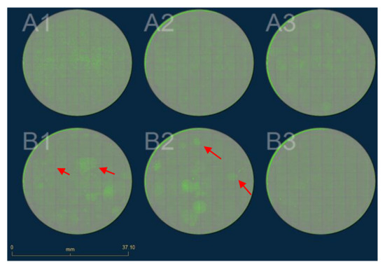 Figure 9. eGFP fluorescence image of polyclonal cells after transfer into 6-well plate with serial dilution. The polyclonal cells are marked by a red arrow. Scale bar = 3.71 cm. Different polyclonal cells are marked by the red arrow. - Transfer of polyclonal cells from 96-well plate to 6-well plate (Figure 9). Add 150 µL DMEM medium with 10% FBS, after treating the former step (step 4, Figure 3) cells with 50 µL trypsin for 5 min, and transfer the liquid into a 1.5 mL Eppendorf tube with 800 µL medium, wash the well with medium from the tube three times, then transfer the cells into a 6-well plate with 10-fold serial dilution from A1 well to B3 well, make the final volume 2 mL medium per well. Culture the cells another 4–7 days (dependent on cell types).