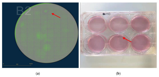 Figure 10. Image of marked monoclonal cells in 6-well plate. (a) Well B2 scanned by eGFP fluorescence, Scale bar = 15.1 mm. (b) Picture of 6-well plate with marked monoclonal cells. The interesting clone is marked by a red arrow.