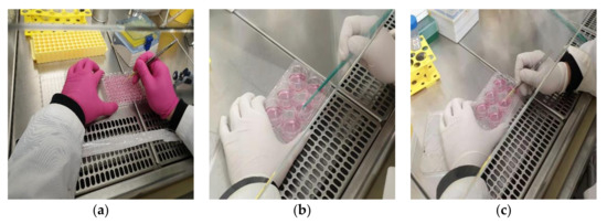 Figure 12. Uninteresting cells eliminate with tips and scraper. Use cell scraper to eliminate the cells at distant location from the marked clone. After that, eliminate the cells that closely surround the marked clone and on the edge of the well carefully by using the pipette tips. (a) Cell elimination by using tips in 96-well plate well. (b) Cell elimination by using cell scraper in 6-well plate well. (c) Cell elimination by using tips in 6-well plate well.