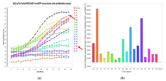 Figure 14. Time-dependent cell growth and eGFP fluorescence intensity of different N2C-pTet-TurboFP635-EF-1a-eGFP monoclonal cells. (a) Time-dependent cell growth of different N2C-pTet-TurboFP635-EF-1a-eGFP monoclonal cells. The clone 3A4 is marked by red arrow. (b) eGFP fluorescence intensity of different N2C-pTet-TurboFP635-EF-1a-eGFP monoclonal cells.