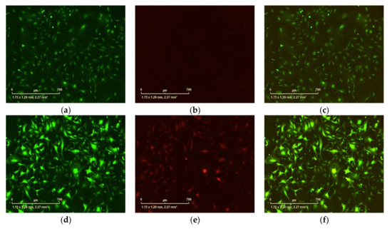 Figure 15. Validation of Tet-off TurboFP635 expression System. N2C-pTet-TurboFP635-EF-1a-eGFP 3A4 cells without transfect with tTA_BFP plasmid ((a–c), scale bar = 0.7 mm). (a) eGFP detection, (b) TurboFP635 detection, (c) Overlap of green and red fluorescence image; N2C-pTet-Turbo-eGFP 3A4 cells transfect with tTA_BFP plasmid ((d–f), scale bar = 0.7 mm). (d) eGFP detection, (e) TurboFP635 detection, (f) overlap of green and red fluorescence image.
