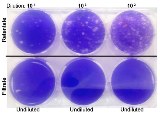 Ultrafiltration methods using membrane-filter devices have been reported previously to concentrate viruses, including SARS-CoV-2 various sample types [8,9,14,15,16]. In those studies, Amicon® Ultra-15 with a 30 kDa MWCO centrifugal filter device was used to concentrate the virus by centrifugation at 4500× g for 10 min at 4 °C. However, in our assays, we found a significant number of SARS-CoV-2 present in the filtrate after passing through filters with an MWCO of 30 kDa, 10 kDa and even 5 kDa (Table 1). In the PFU assays, we observed that the VeroE6 cell supernatant containing 5 × 105 PFU/mL of SARS-CoV-2 was reduced to about 10 PFU/mL through filtration using a 30 kDa MWCO filter, while about 5 and 2 PFU/mL was noticed after filtration through 10 kDa and 5 kDa MWCO filters, respectively. However, ultra-filtration with a 3 kDa MWCO filter removed the viral particles to an undetectable level in our PFU assays (Figure 1).