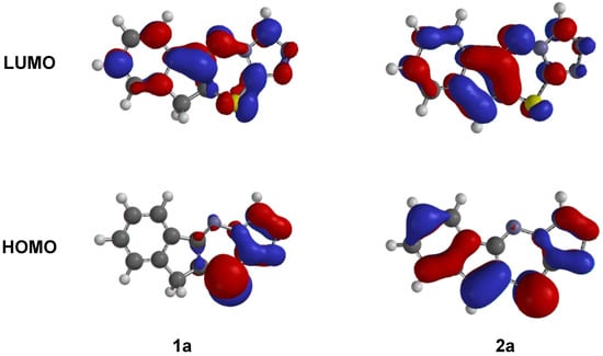 Molecular orbitals of triazolothiadiazine compounds 1a and 2a calculated on structures geometry optimized using B3LYP/6-311+G** density functional theory.