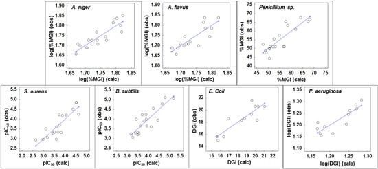 The QSAR equations developed for antifungal and antibiotic properties are shown in Table 3, and the plots of observed vs. predicted activities for the models are in Figure 2. Overall, this protocol is not automated and allows for customization. The models were developed using a training set of molecules and validated internally against the training set and externally with the test set. The compounds in the training set include all the compounds with minimum and maximum activities for each of the fungi and bacteria to ensure that external validation of the models was within the QSAR model’s range of development and to avoid extrapolation beyond the training set. The five compounds of the test sets for all seven QSAR models are 1d, 1g, 1i, 1l, and 2i.